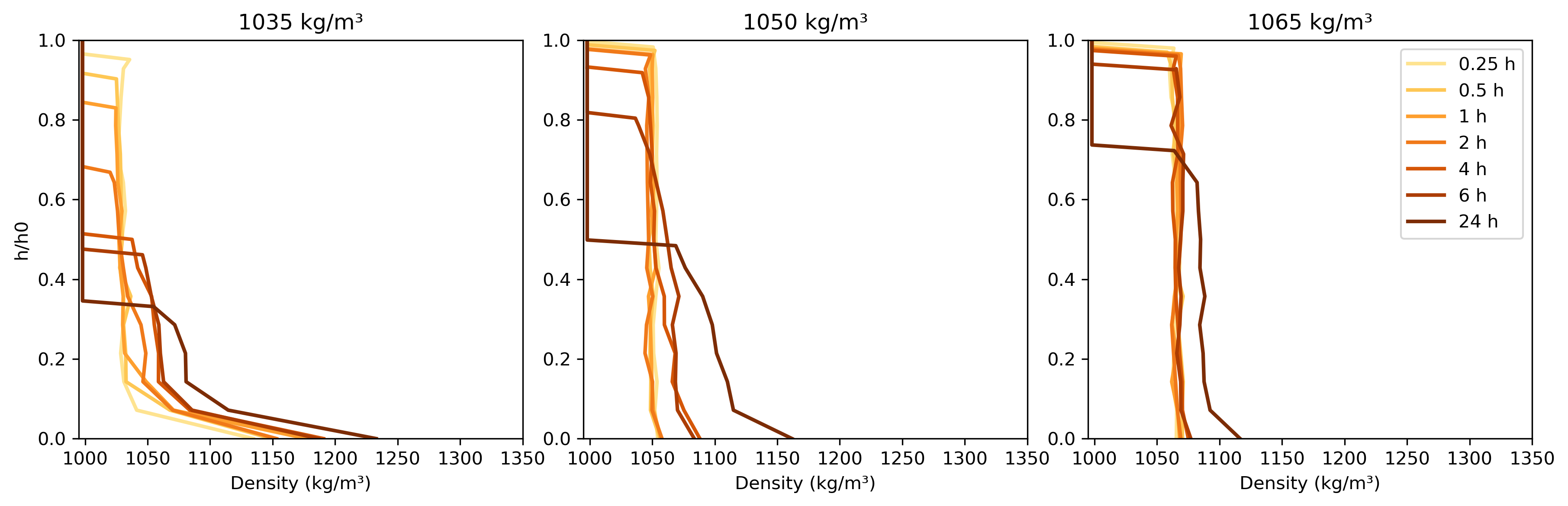 NE1-8_1035_DensityProfiles.csv -> Time-dependent density profiles of sample NE1-8 with an initial density of 1035 kg/m³. The initial height of the suspension is given in the .csv file (70-80 cm).